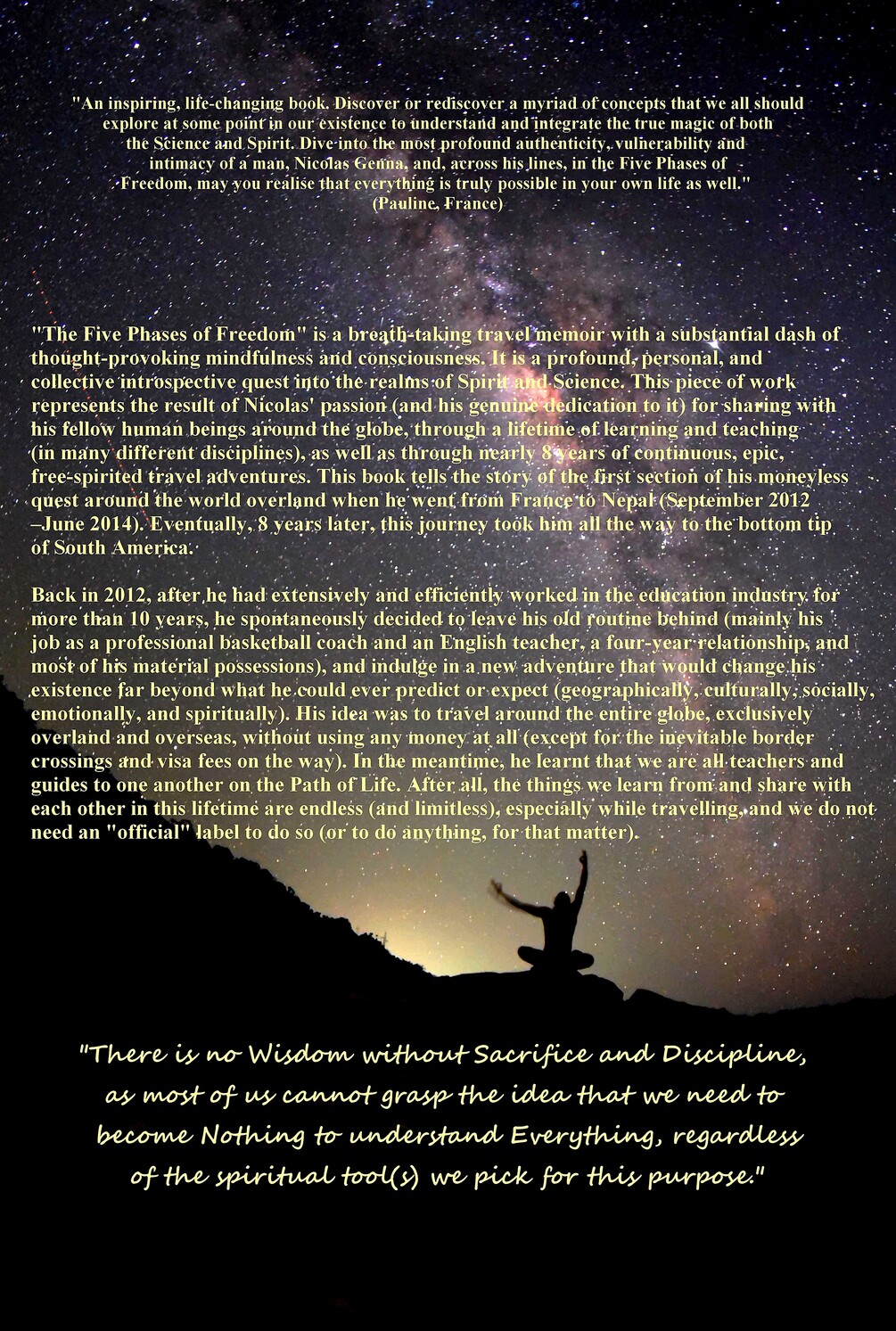 "The Five Phases of Freedom" is not merely a travel diary but a comprehensive study of societal, philosophical, and metaphysical exploration. It reflects the intense lessons and emotional and spiritual development that Nicolas experienced along the way. The book captures the essence of being human, living with heart and soul, and harmonizing the Science and Spirit that shape our existence—two approaches that he has found to be not just compatible, but profoundly complementary.